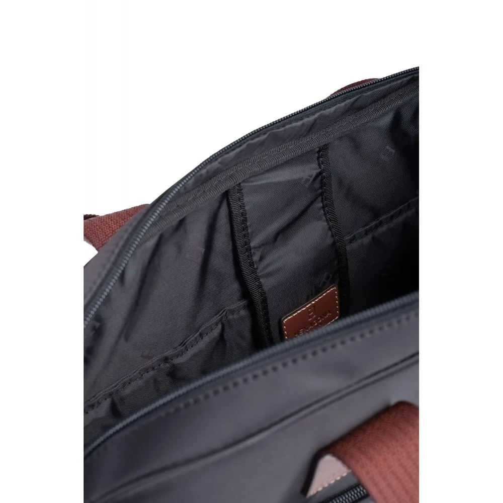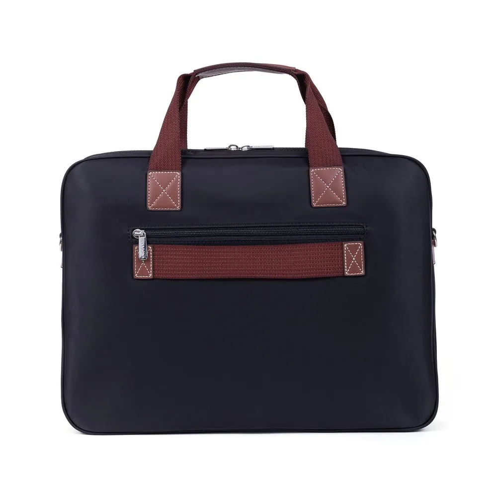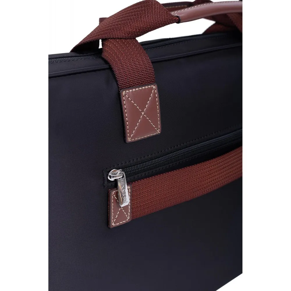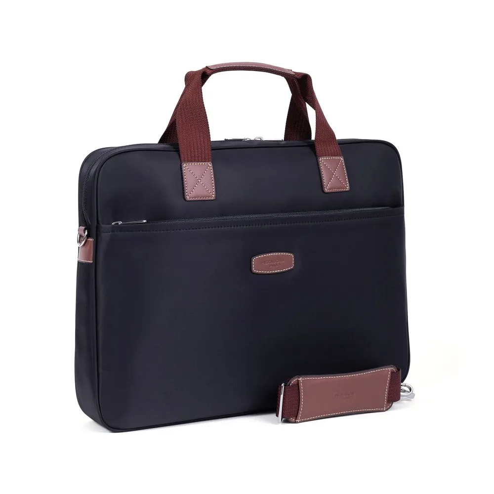 Zip fasteningOuter material : Nylon with split leatherLining : SyntheticShiny silver detailsOuter : one front and one back zip pocketsInterior : inner compartments and mobile phone pocket17” laptop and A4 format compatibleNon-adjustable handles (36,5 cm)Trolley passing