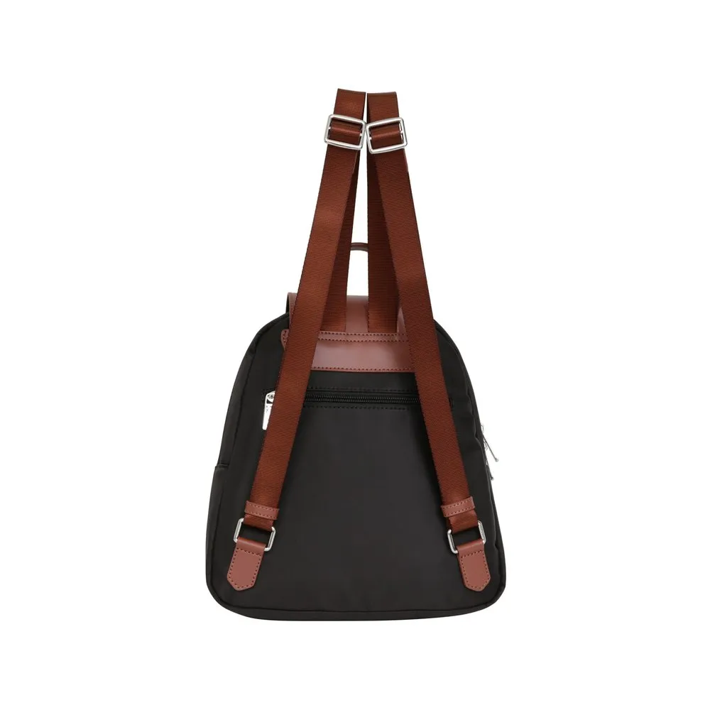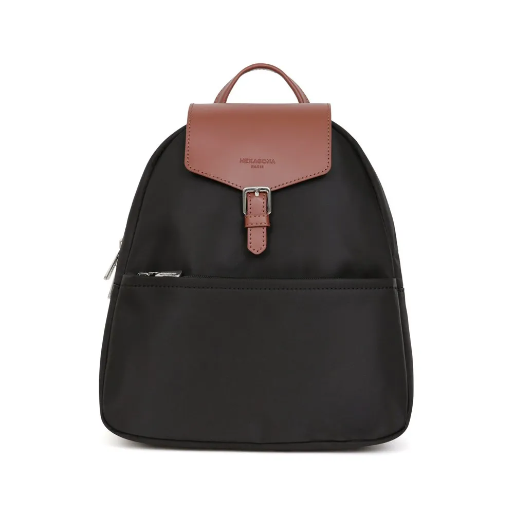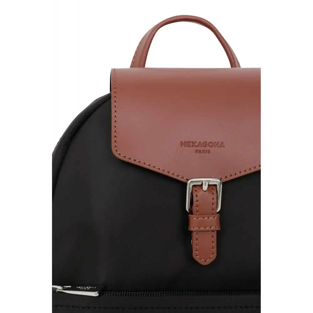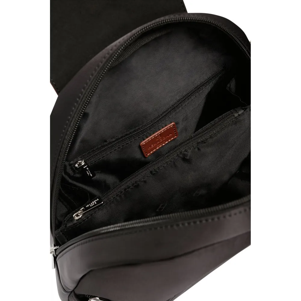 Zip fastening and flap fastenerOuter material : Nylon with split leatherLining : SyntheticShiny silver detailsOuter : one front and one back zip pocketsInterior : inner compartments and mobile phone pocketWaterproof material