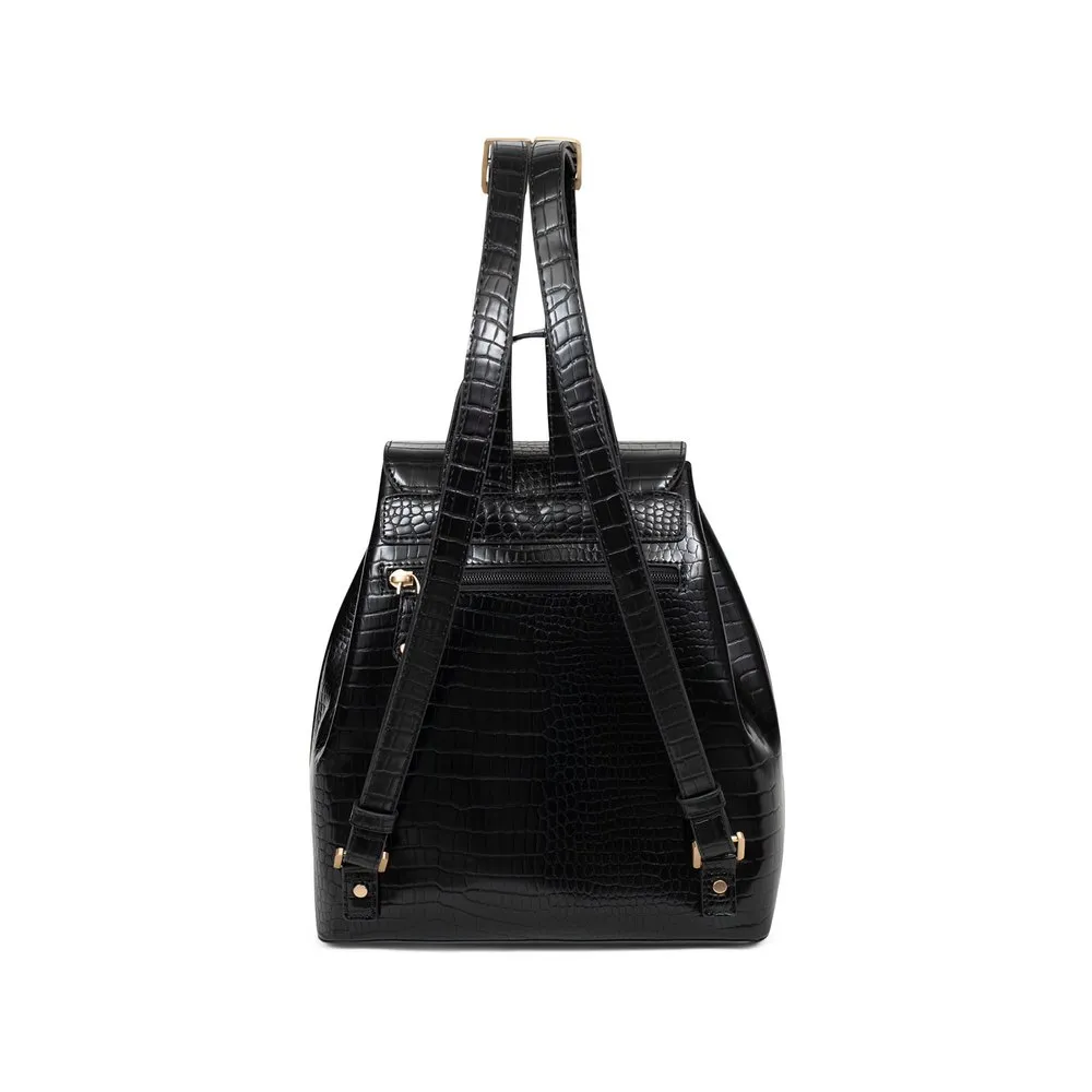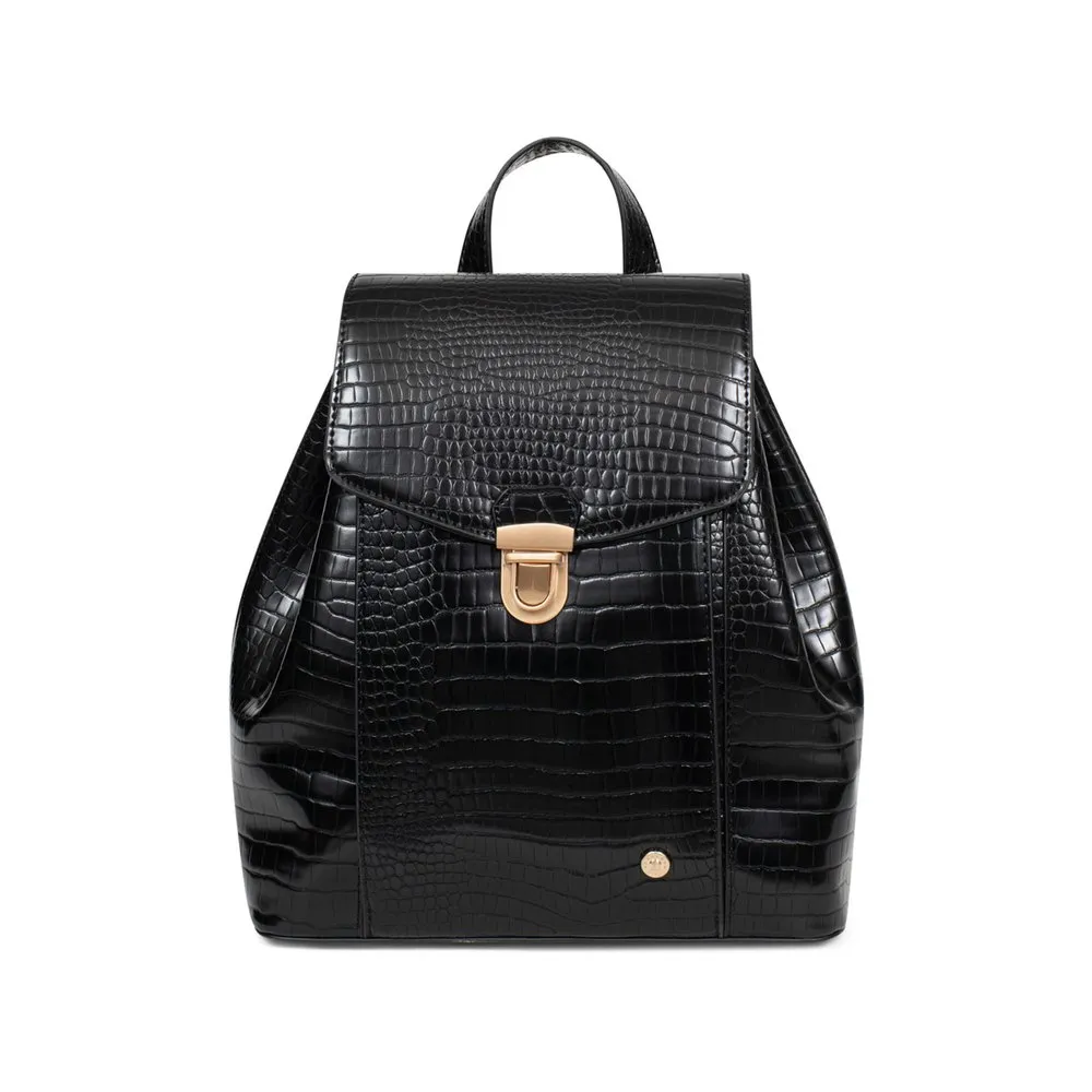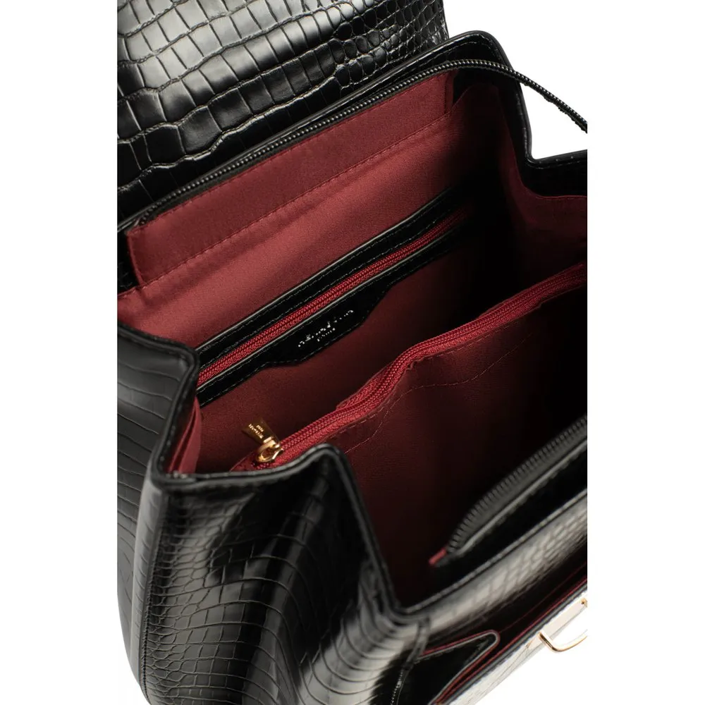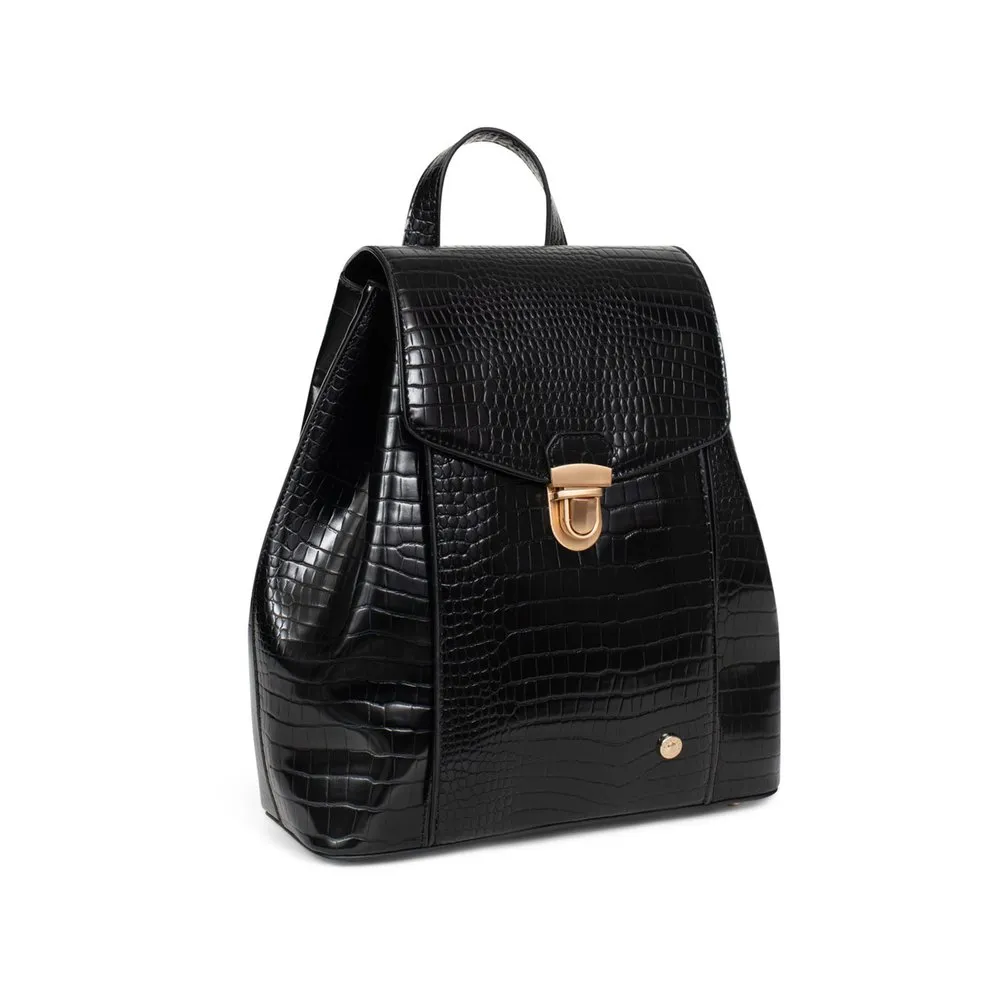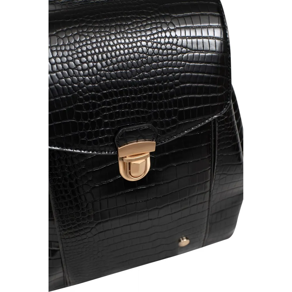 Dimensions: W 28,5 x H 29 x P 13 cm.Weight: 0,6 kg.Material: crocodile-style synthetic.Lining: synthetic.Finishing: brushed gold.1 flap fastening with clasp. 1 zip fastening.Outer: 1 front pocket. 1 flat zipped back pocket.Interior: 1 main compartment with 1 zipped separation pocket. 1 flat zipped pocket. 2 flat pockets (including 1 phone compartment).Compatible with mobile phone.2 non-removable adjustable straps (51 cm mini/99 cm max). 1 non-removable non-adjustable handle (20 cm).