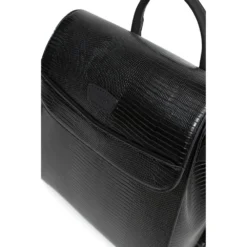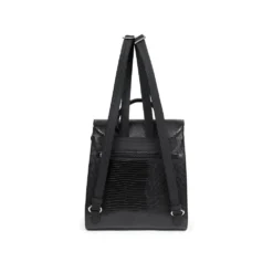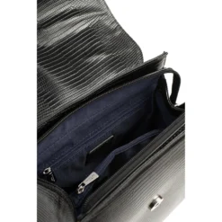 Dimensions: W 23 x H 26 x P 11,5 cm.Weight: 0,55 kg.Material: lizard grained synthetic.Lining: synthetic.Finishing: shiny silver.1 magnetic flap fastening. 1 zip fastening.Outer: 1 flat zipped back pocket.Interior: 1 main compartment with 1 zipped separation pocket. 1 flat zipped pocket. 1 phone compartment.Compatible with mobile phone.2 non-removable adjustable straps (55,5 cm mini/103 cm max). 1 non-removable non-adjustable handle (23 cm).