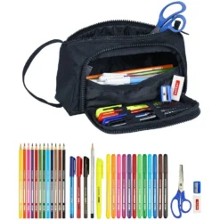 Includes :1 pencil, 1 pair of scissors,1 Sharpener, 1 eraser, 3 pens, 1 marker, 12 felt-tip pens, 12 colour pencils.